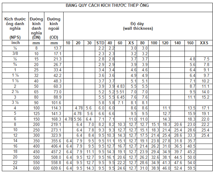 BẢNG QUY CÁCH THÉP ỐNG ĐÚC CHẾ TẠO CT3/ CT45/ CT50/ C45/ C50/ C30/ C20 THAM KHẢO
